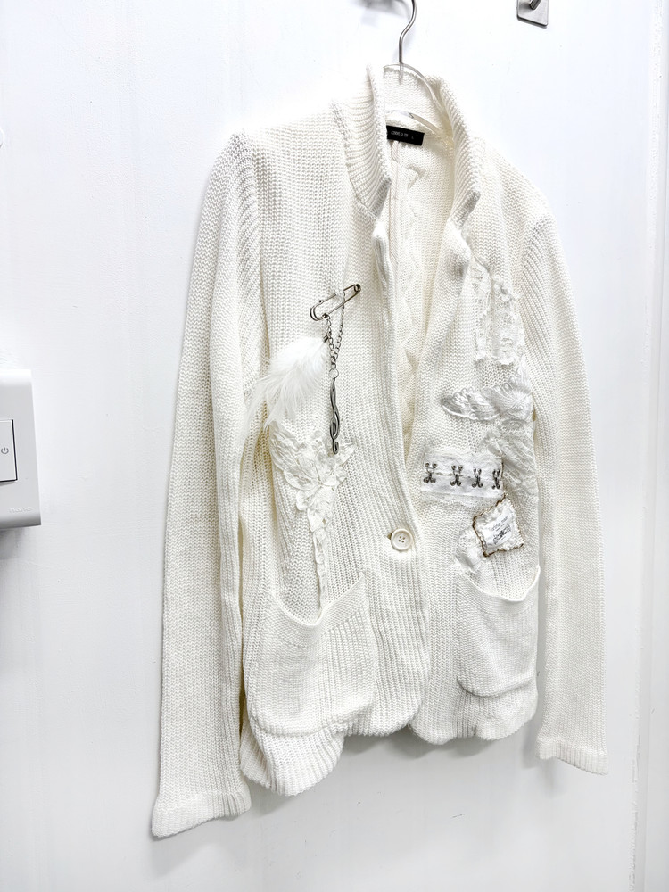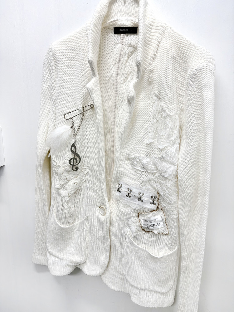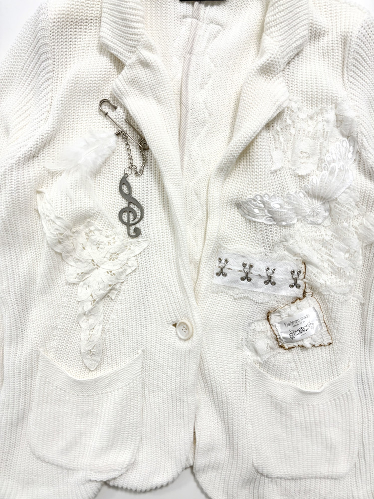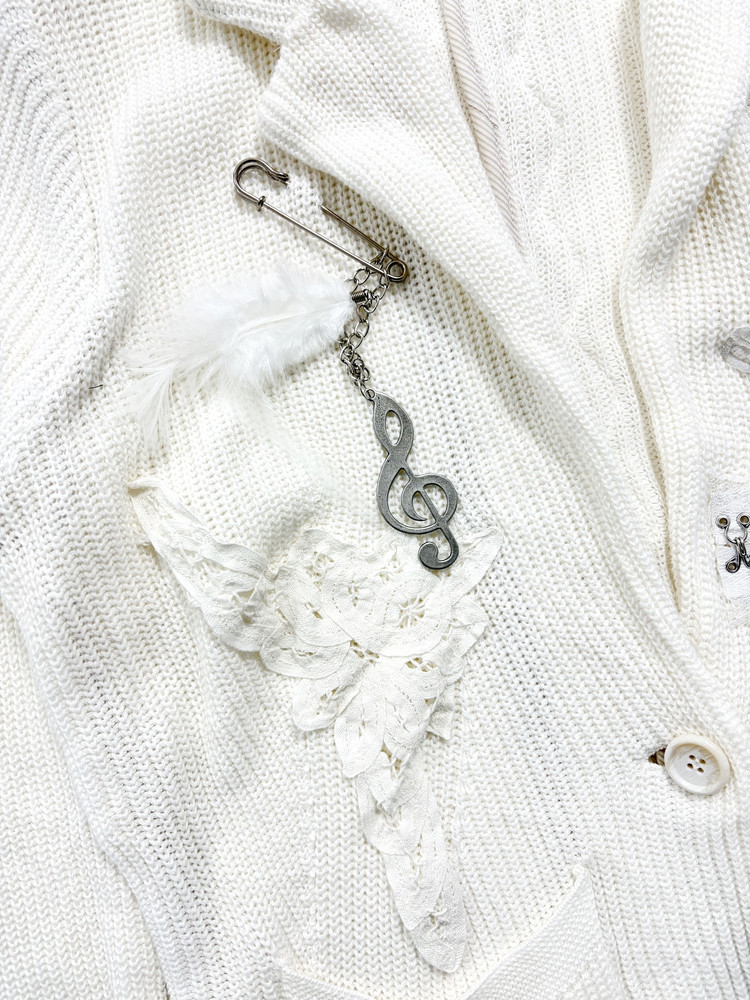 천사와 같은 심성을 상징하는 날개, 그녀의 성격을 닮은 음표와 깃털 부자재를 사용해 브로치로 포인트를 더했습니다. 불에 그을린 듯한 표현으로 소녀의 어두운 면을 은유적으로 담아낸 자켓입니다. * COMME CA ISM 브랜드의 빈티지 의류를 리폼하여 제작되었습니다.