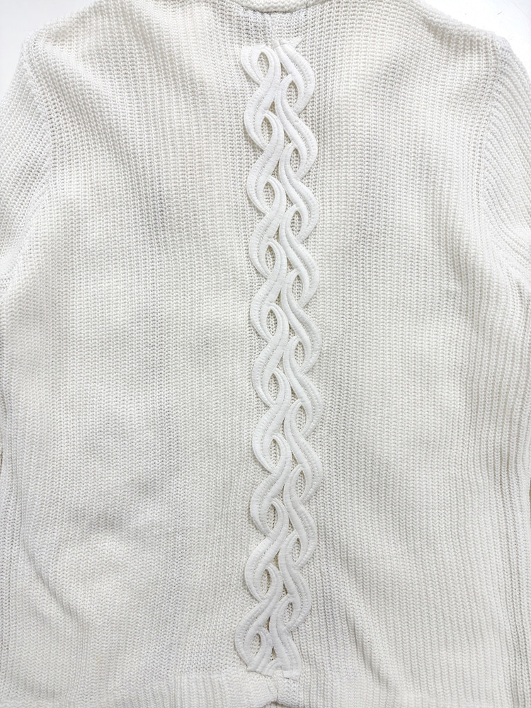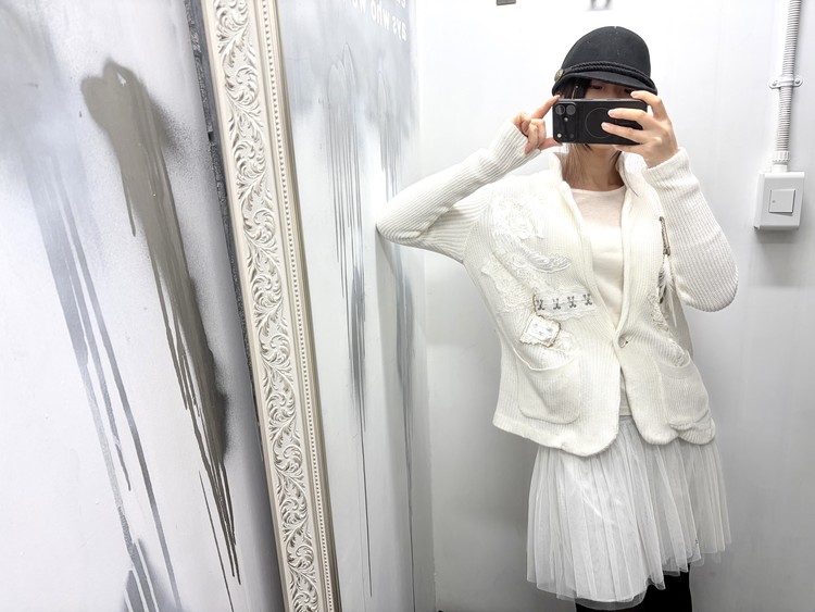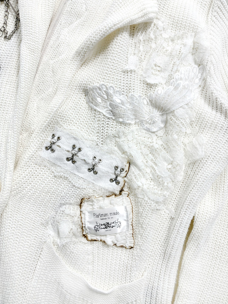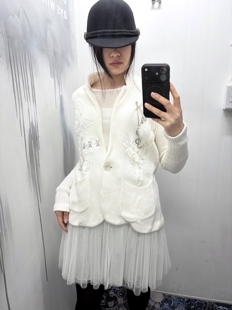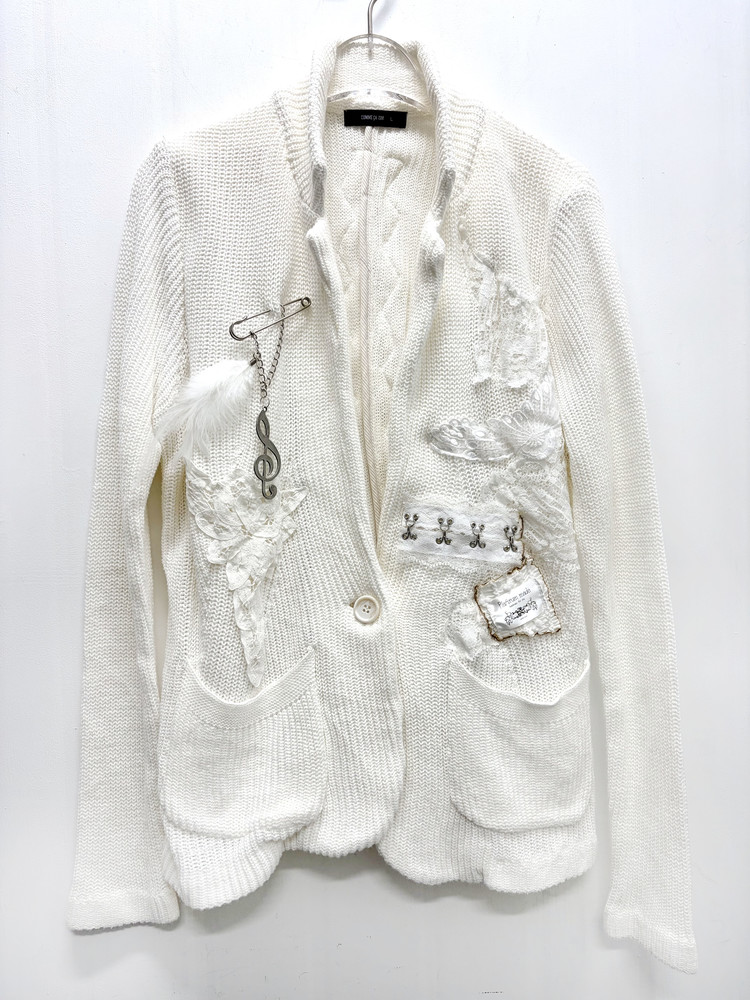 천사와 같은 심성을 상징하는 날개, 그녀의 성격을 닮은 음표와 깃털 부자재를 사용해 브로치로 포인트를 더했습니다. 불에 그을린 듯한 표현으로 소녀의 어두운 면을 은유적으로 담아낸 자켓입니다. * COMME CA ISM 브랜드의 빈티지 의류를 리폼하여 제작되었습니다.