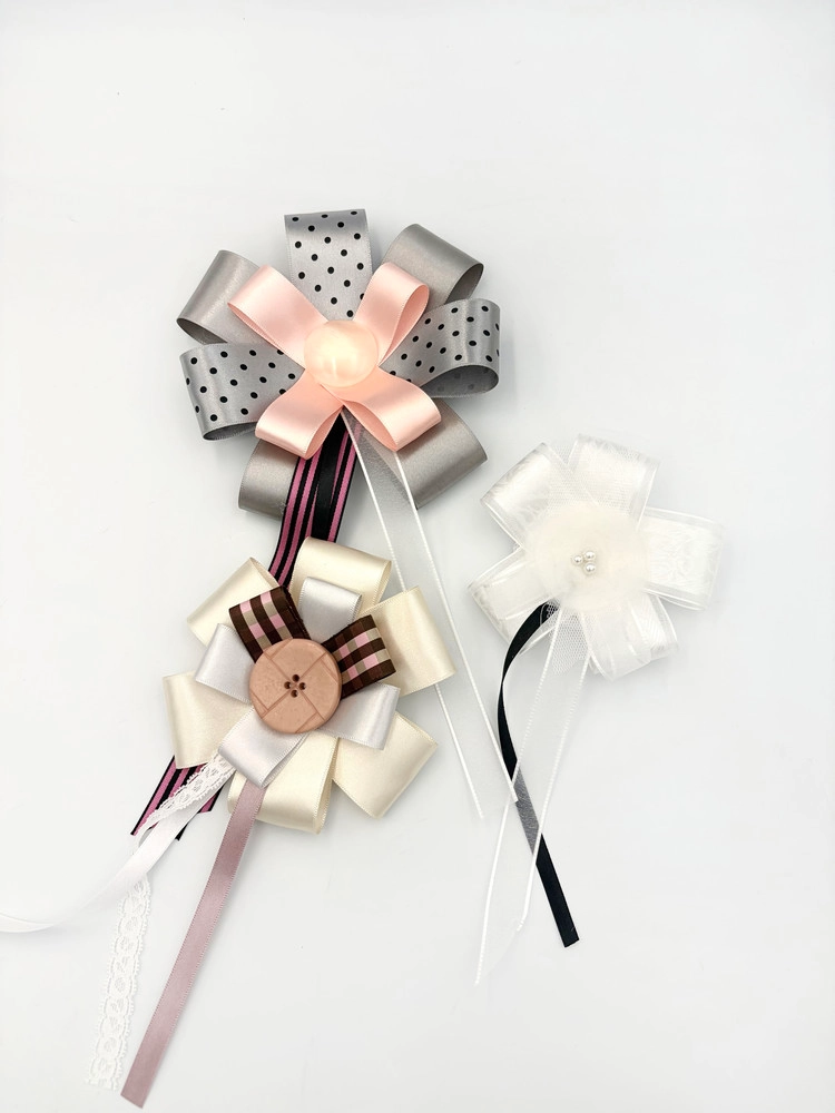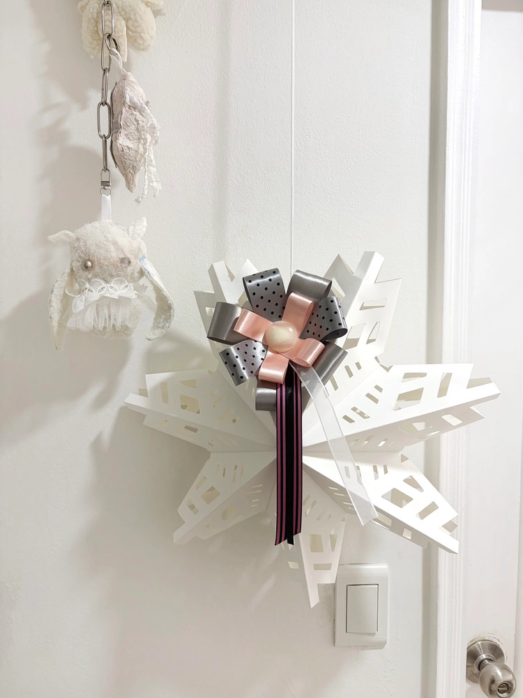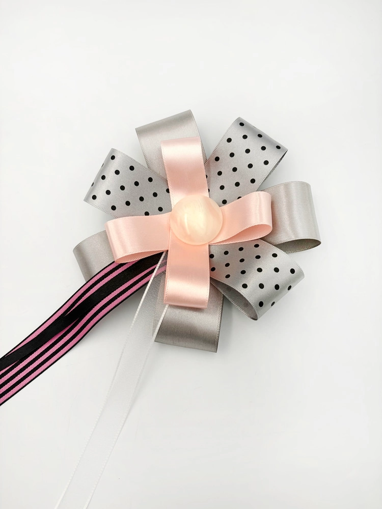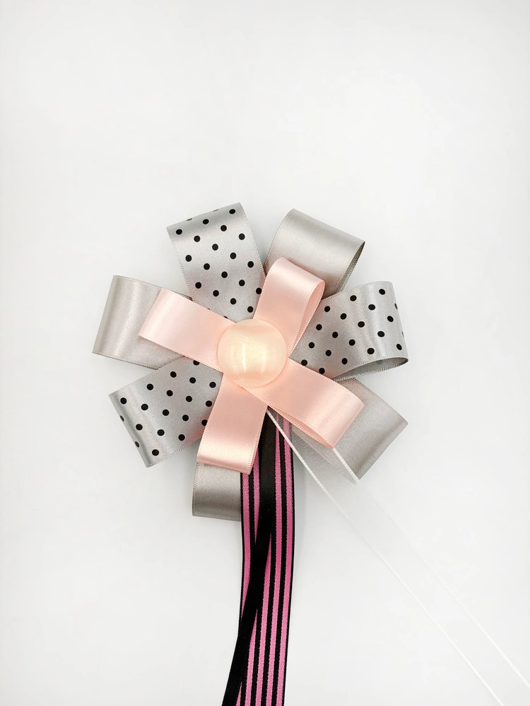 체리빛 핑크 리본과 메탈릭 실버 리본을 조합해 사랑스러운 포인트를 더한 로제트입니다.