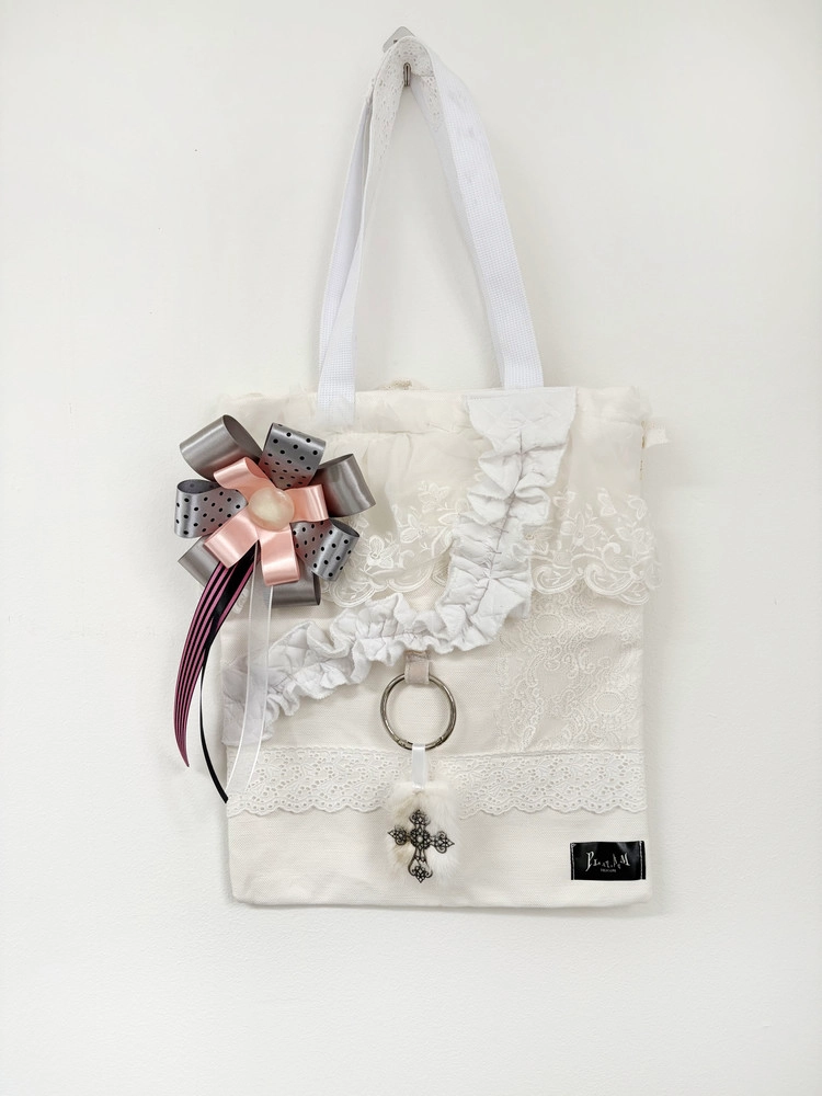 중앙의 단추 장식과 스트라이프 리본 디테일이 어우러져 가방이나 소품에 달기 좋은 감각적인 오브제가 됩니다.